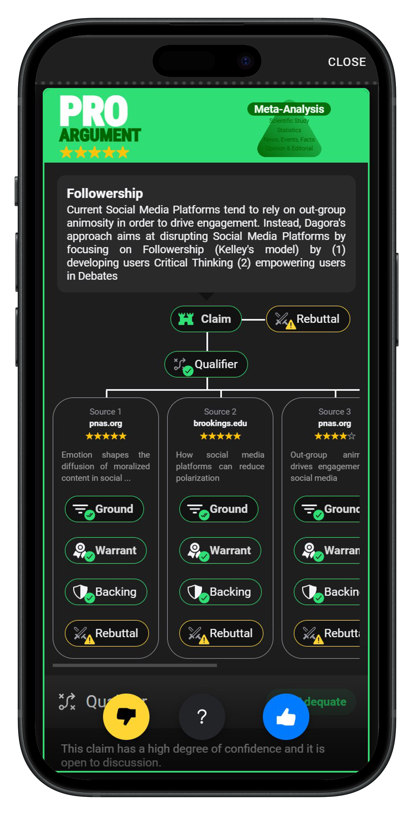 Dagora is not just another social network. It is a complete disruption of the current state of online platforms. While traditional social networks focus on engagement and superficial interactions, Dagora is built with a singular mission: to elevate users' critical thinking.