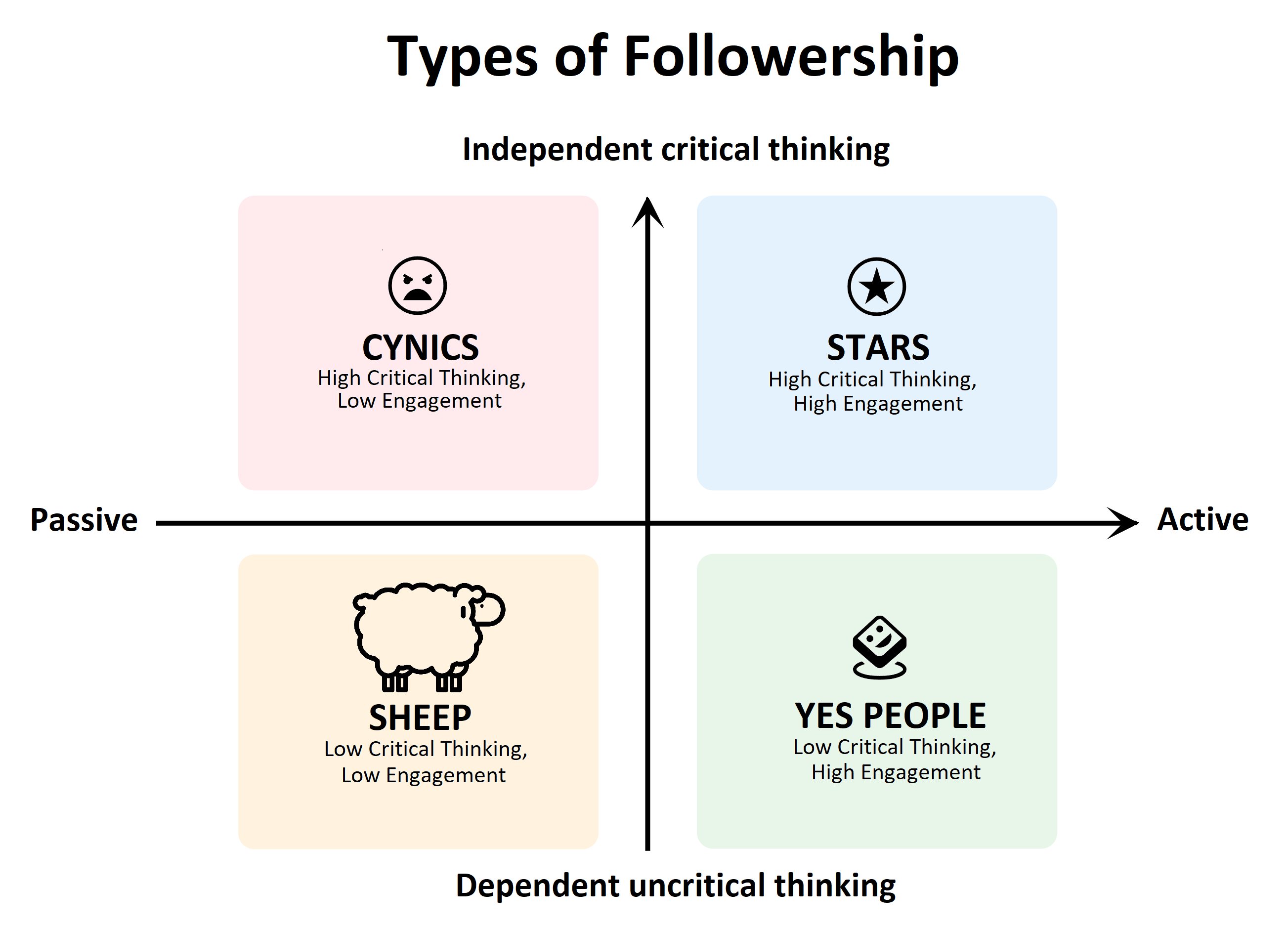 According to Robert Kelley, followers can be catagorized based on two key dimensions: Critical Thinking and Engagement