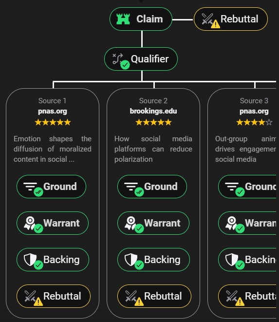 Quickly assess any argument quality thanks to Toulmin Model by breaking them into clear components—claim, grounds, warrant, backing, qualifier, and rebuttal.